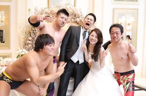 披露宴ではご新郎友人の方からプロレスのご余興が! ご新郎お父様も登場され気合の一発。闘魂注入!!