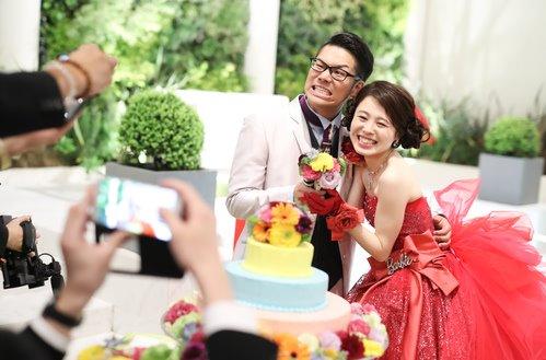 結びはお二人らしく笑顔いっぱいでケーキ入刀!!その後はゲスト全員でデザートブッフェを♪♪お二人らしくカラフルでとても可愛いデザートがいっぱい!!