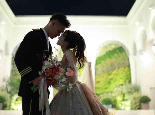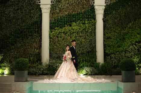 ゲスト皆様をお見送りした後、お二人だけで写真撮影タイム♪ライトアップされたプール付きガーデンには、キャンドルが煌めきラグジュアリーな空間に。自然光降り注ぐ雰囲気とはガラッと印象が変わります。グリーンウォールを背景に撮影されたお写真は、お色直しされたお衣装がとても映える素敵な写真でした。ガーデン以外にも撮影された凱旋門でもお写真もお二人らしさが出た素敵なお写真でした。