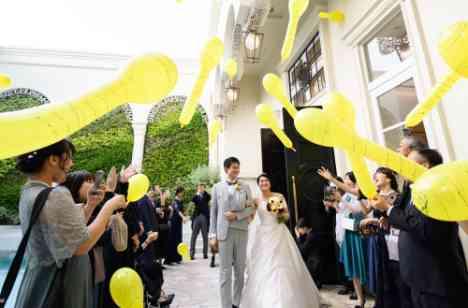 結婚式はおふたりの「好き」を沢山詰め込んで、おふたりらしさとゲストの皆様への感謝の気持ちを随所に感じられるとても楽しい瞬間で溢れていました。野球が大好きなふたりは、挙式後のプール付きの開放的なガーデンでゲストの皆様がつくられた花道を通りながらの「フラワーシャワー」ではなく...「ジェット風船」!!「おめでとう!」の声と共に風船が上がっていく様子はとてもおふたりならではのシーンとなりました!