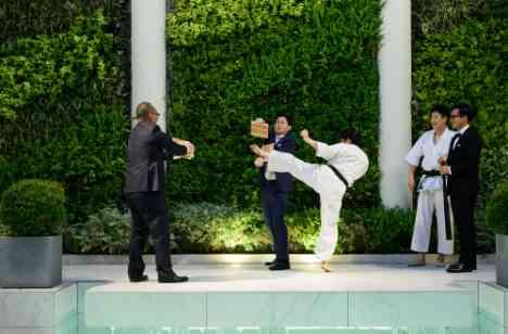 おふたりの1回目のお色直しはウェディングドレスとタキシードから一気に雰囲気を変えて...「空手着」へチェンジ!新郎様の肩車で披露宴会場に入場され、そのままゲストの皆様をお隣のガーデンへご案内♪ここからは、両家のお父様のサポートをいただきながら、新郎新婦おふたりでの空手演武のスタート!ガーデンのグリーウォール前のステージでの演武は空手着が映え、圧巻でした。