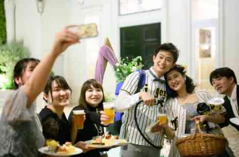 おふたりの2回目のお色直しはカラードレスとタキシードへ!先程の雰囲気とはガラッと変わってのご入場。おふたりはこっそり披露宴会場を抜け出して、大好きな野球のユニホームへお着替えを...そしてお酒が好きな皆様に向けて新郎自らビアサーバーを背負って、デザートタイムのスタートのお知らせ!デザートもお酒もたくさん堪能いただき盛り上がりました!