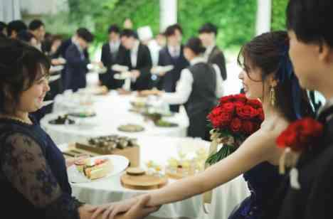 お色直しのご入場をされたおふたりからのゲストの皆様へのサプライズ演出として「デザートブッフェ」をご用意されました。20~30種類のデザートが貸切ガーデンにずらっと並び、女性ゲストも男性ゲストも皆様たくさんお好みのデザートを取りながら楽しまれました!おふたりもゲストの皆様と一緒に写真撮影や会話を心ゆくまでお過ごしいただけました。