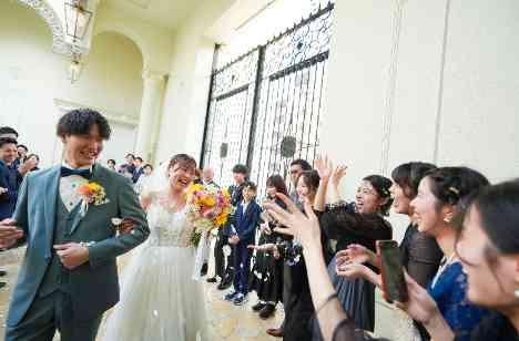 緊張ながらに挙式が結び、ようやく大切なご友人様とのご対面。今日という日に大好きな皆様に囲まれておふたりも、ゲストの皆様もココロオドル瞬間となりました。 花道が親族様から始まり、友人様へと続いていき一歩一歩進むごとによりその先が華やかな道へ彩られていきます。貸切ガーデンならではのフラワーシャワーとなります。