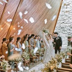 【ウッドデザイン賞2023受賞】「光のトライアングル」をコンセプトに2023年2月にリニューアルしたチャペルは木の温もりと石造りの祭壇が調和。圧巻の天井高と降り注ぐ光に包まれながら神聖な挙式を体感して