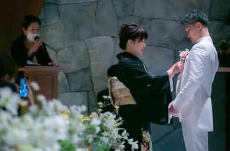 ご新婦様はお母様から最後の身支度のお手伝いとしてベールダウンを行っていただきますが、ご新郎様には挙式中にお母様から最後の身支度のお手伝いとしてブートニアを付けていただくという【ブートニアセレモニー】を皆様の前で行っていただきました。人前式だったため、司会者からしっかりと意味を伝えてセレモニーを行ったため、お母様もすごく嬉しそうで素敵なシーンとなりました。