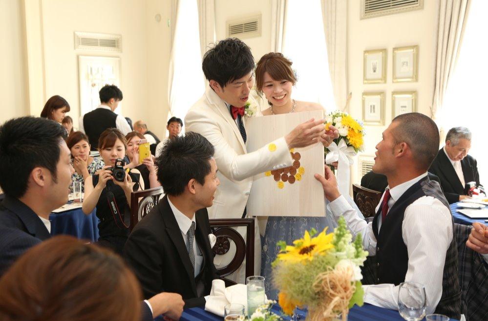 テーマのひまわりに合わせてテーブルラウンドでメッセージカードを集め、ゲストとつくる世界に一つの向日葵を作りました
