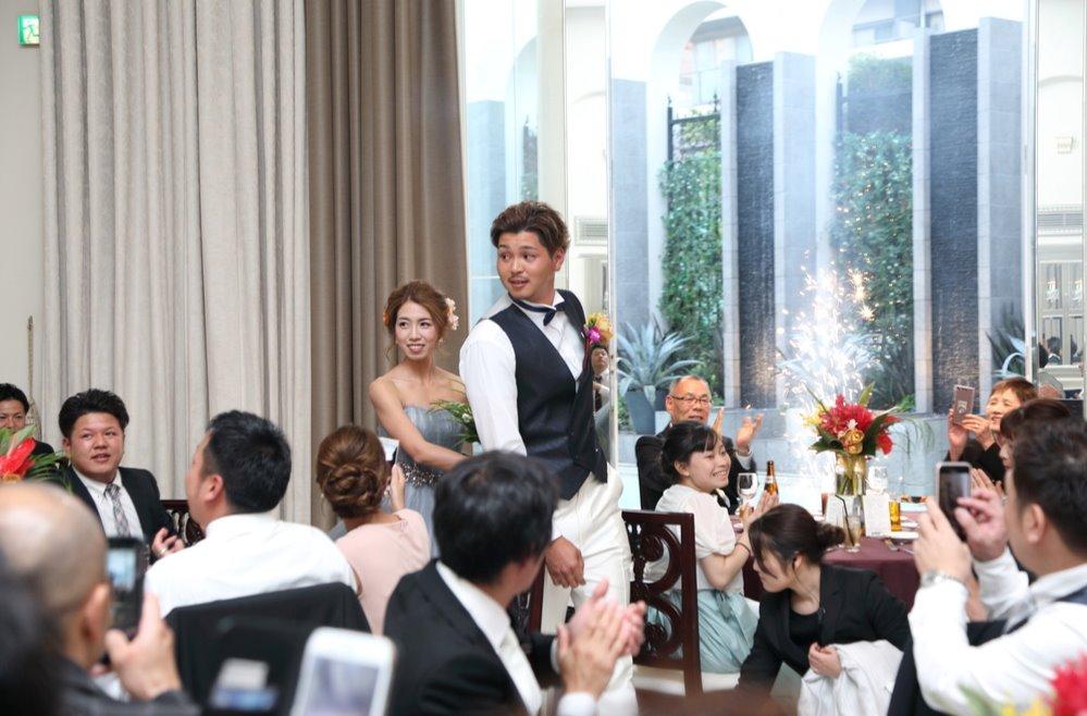 共通のゲストの方も多いお二人に、対面で座る事をご提案。向こう側のゲストの方の感動や笑顔の表情が伝染しますように・・距離が近いと感動も伝わりやすいと言われております。 大切なご友人からの誓いの言葉。想いをかみしめ、誓っていただきました。