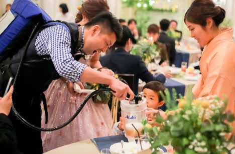 新郎様のこだわり、ビアサーバーラウンド。背負って、かっこよく登場したかと思ったら、ご友人の所には大胆に。ビールを注ぎながらゲストと会話を楽しむ時間。ラウンド後は、「one more cheers!」二度目の乾杯!