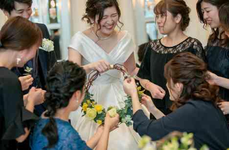 ゲストとゆっくりお話しがしたい、感謝の気持ちを伝えたいとのお二人だったので各テーブルをゆったり周りながら、カラードレスでお持ちになるブーケを完成させました。だんだん出来上がってくるブーケにゲストもワクワク。ゆったりと、あたたかい時間でした。