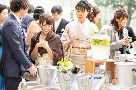 メリハリをつけるため、挙式は厳かにキリスト教式で執り行われその後はガーデンでウェルカムパーティー!見た目も可愛く、ゲストも「わあ!」と反応◎おふたりと写真を撮ったり、ドリンクを飲んだりピンチョスをつまんだりと、緊張のほぐれる瞬間!