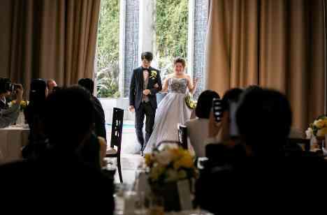 お色直しの入場は、一面ガラス張りのガーデンからご入場いただきました。 扉に注目されている方もいらっしゃる中で、サプライズのご入場!日の光が差し込みカーテンがOPENすると雰囲気ががらっと変わりました。
