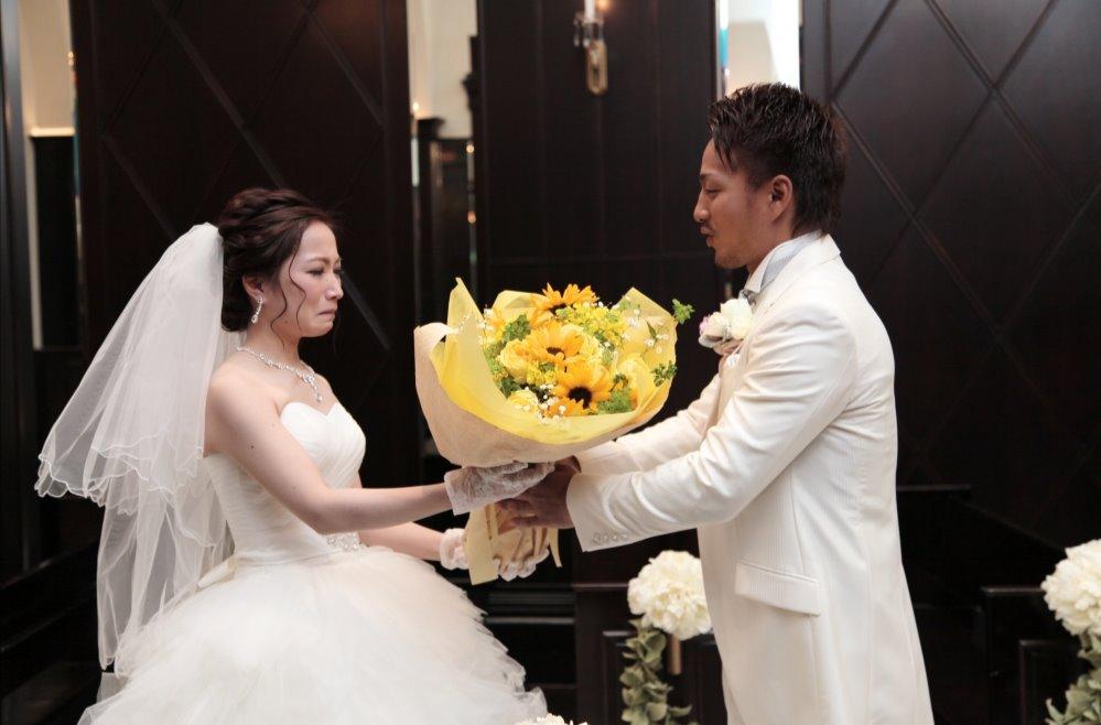 普段言えない感謝の気持ちを、新郎様に伝えて頂く時間を設けました。 お二人がご入籍された、夏の季節を連想する向日葵。 お二人の結婚式のテーマカラーでした。 挙式会場でサプライズの花束のプレゼント。 その後の挙式でしたので、ホッコリ笑いあり、涙ありの温かい時間を過ごすことが出来ました。