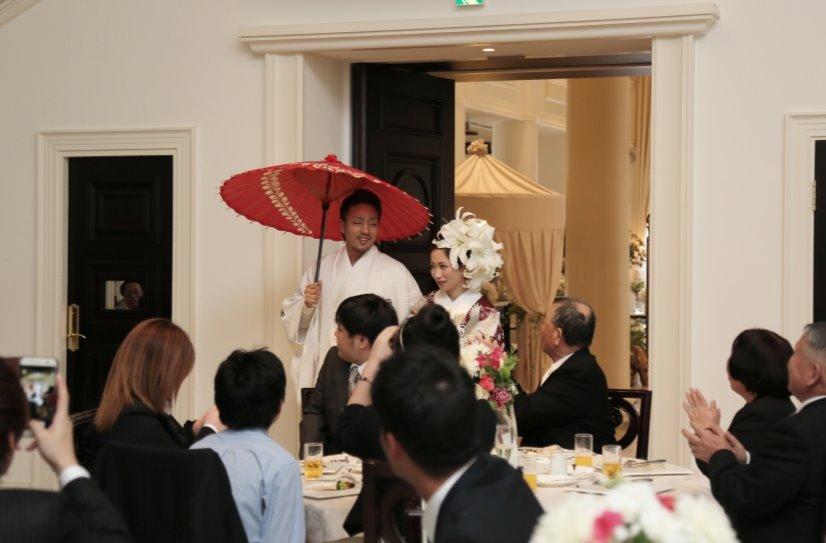 お色直しでは和装でのご入場。 番傘をさしてのご入場は和装ならではです。 ご新族様やご友人様のみの披露宴でしたので、入場時は大歓声が上がる程の大盛り上がりでした。