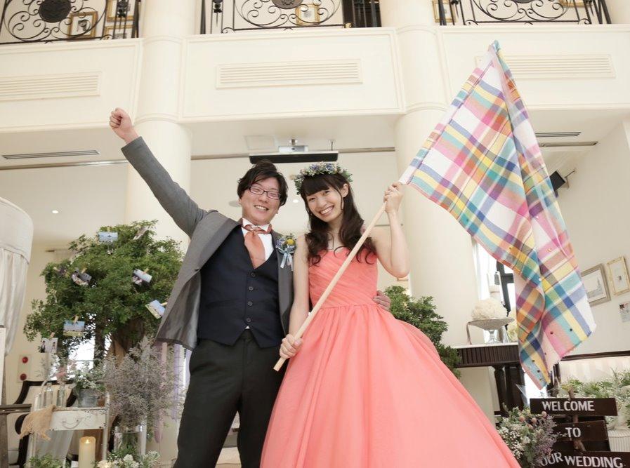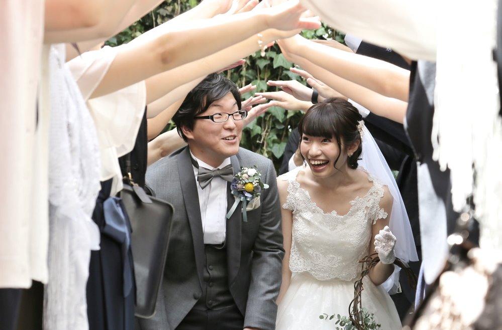 挙式後はテーマである「つながり」を大切にし、ゲスト全員からのアーチをくぐって祝福!