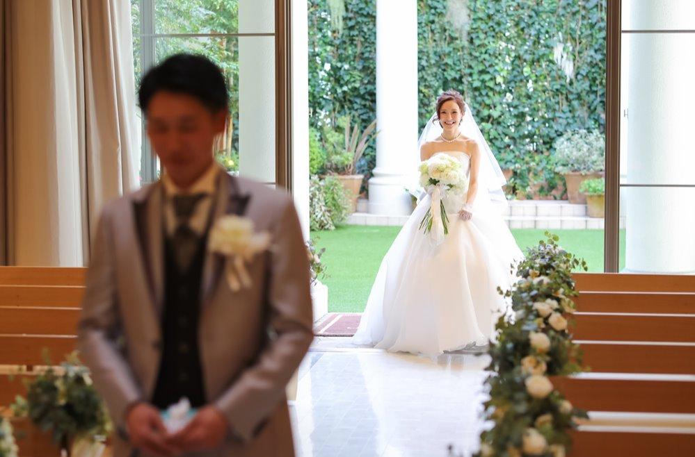ハープとヴァイオリンが奏でる音色が会場中を優しく温かく包んでいきます♡ゲストの心の温度もより一層高まり…いよいよ挙式スタート 入場シーンに涙をする人や嬉しそうに祝福する人たくさんの愛情が溢れる中、お二人の大切な愛の誓いを行う場