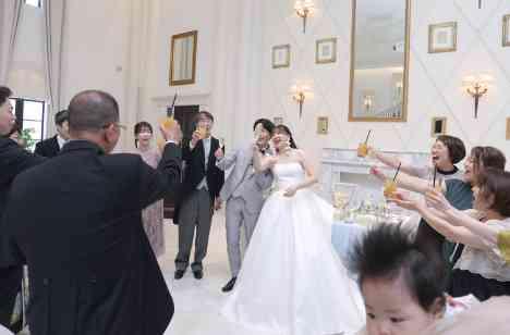 ゲストも自分たちも居心地のいい空間。披露宴をそんな雰囲気にしたかったおふたりは、乾杯の発声の方をあえて立てず、みんなで集まって円になって「かんぱ~い!」。緊張もほぐれ、ゲストの皆様といつも通りの自分たちで過ごせたおふたり。少人数だからこそ出来る、アットホームな空間を最大限に活かしたウェディングパーティーのスタートとなりました。