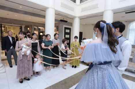 せっかく参加いただくなら一緒に楽しんでもらいたい!ゲスト目線から演出を考えられたおふたりは、宝くじの抽選やわんちゃんも巻き込んだ参加型のゲームを行いました。中でも、新婦様のご友人様へワクワクするようなゲームをご用意しました。披露宴の終盤でゲストにはロビーへお集り頂き、1名様だけプレゼントが当たるブーケプルズを行いました。これまで温度感が高まっていたゲストの皆様は、大盛り上がりで楽しんで頂けました。