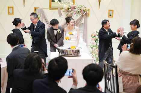 ケーキセレモニーではおふたりのファーストバイトの前に夫婦の先輩でもあるご両家親御様にお手本バイトを行っていただきました。ゲストの方も近い距離感の中、ノリノリの親御様は登場からゲストの方とハイタッチしながら出てきてくださり、しっかりとお手本を見せていただきました。ご両家での仲が垣間見えたおふたりらしい時間になりました。