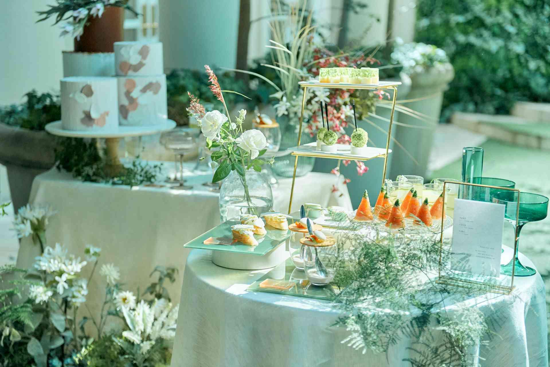 演出の一つにもなるウエディングケーキやデザートビュッフェ。お二人のイメージをプラスして楽しいひと時に♪