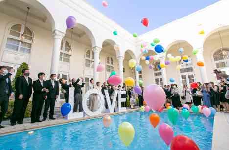 「ゲストの皆様にもご参加いただいて楽しんでいただけるように!」と心を込めて考えてくださり、ドロップ&フライの演出をおこないました! 当日のお天気は絶好の晴日和! プライベートプールに向かってバルーンを一斉にトス、光輝く青空に向かってバルーンをリリースしていただきました! ご新婦様のお好きなお色味で彩った素敵な演出でございました!