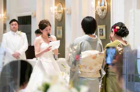 ご新婦様のお色直し中座は妹様お二人と一緒に。 中座の前にはお手紙を読んで、一緒に過ごしてこられた頃の思い出や感謝の思いを伝えて頂きました。 ご新郎様の中座も同様に、おじい様おばあ様様にお手紙を読んで頂いてからの中座でした。妹様もおじい様もおばあ様も、涙をされながら聞いていたのがとても印象的でした。