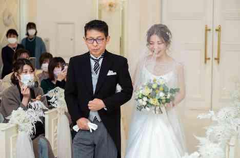 運命の一着を身にまとったご新婦様とご一緒に「ご新婦様のこれまでの人生」という意味のこもったバージンロードを一歩一歩大切に歩いて頂きました。 幼少期の思い出を振り返っていただけるシーンです。お父様からご新郎様へのバトンタッチの瞬間。 「娘をお願いします」という強い気持ちを込めて、見送っていただきます。