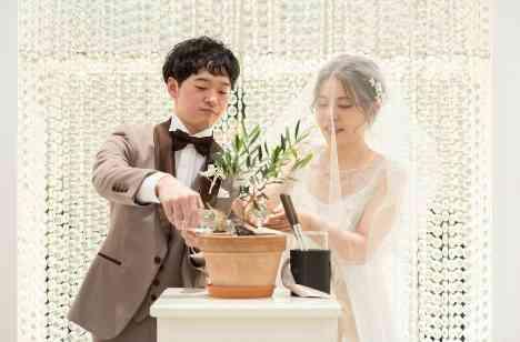 ゲストの皆様に立会人になってご参加いただく人前式は、お二人オリジナル!オリーブの樹には、「幸せを運ぶ樹」という意味があります。皆様には、挙式が始まる前の時間、オリーブの苗木に土を入れていただきます。仕上げは、お二人が「結婚式にきてくださった皆様がこれからも平和で幸せな日々が過ごせますように...」と願いを込めて注がれました。