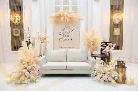 会場コーディネートは、新婦好みのホワイト×ダスティピンク。ふわふわとしたパンパスグラスを飾ったことで、季節感たっぷりの空間に。また、高砂はソファにして、ゲストとふれあいながらパーティを楽しんだ。 「デザートビュッフェでは好きなスイーツやフルーツを振る舞い、女性や子どもさんたちに喜ばれました」と新婦。和やかな時間をゲストと一緒に過ごしたとのこと。