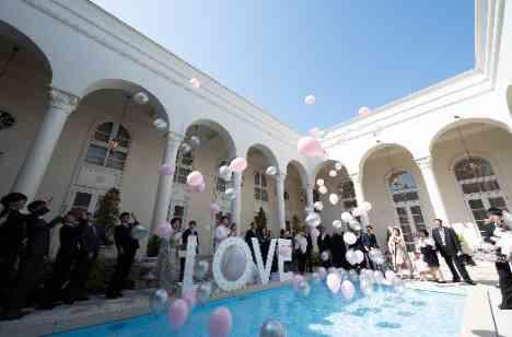 姫路市でプールのついているガーデンがある会場は、ここアーヴェリール迎賓館だけ。挙式が結んでからプールを全員で囲って行うドロップアンドフライはゲスト全員参加型の演出で、サプライズ要素も満載!みんなの歓声が印象てきでした。しかも飛び上がったバルーンが、空のキャンバスに描かれていく様子がとても素敵でした。