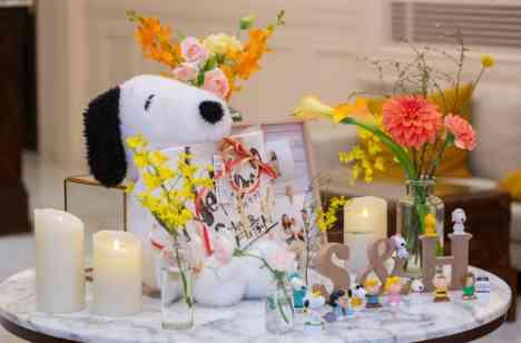当会場は、貸切のためロビーからお二人らしさを詰め込めます。スヌーピーが大好きなご新婦様は、事前に沢山のグッズを持ってきてくださいました。当日は、テーブルの上やソファ至る所にスヌーピーがいる幸せな空間を創り上げることができました。また、当日お持ちいただくアイテムに合わせてお花の装飾も施されており可愛い空間に仕上がりました。