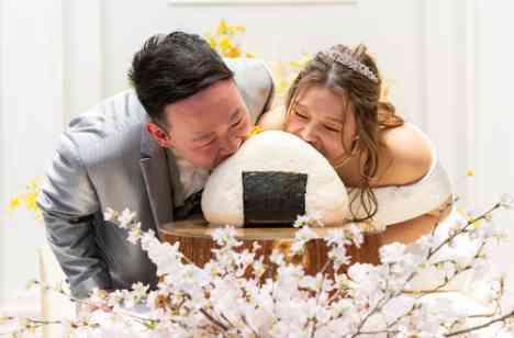 披露宴では、食べることが好きなお二人にぴったりなおにぎりセレモニーを行いました。当日おにぎりは、サプライズで扉から登場し会場は大盛り上がりでした。また、大きなおにぎりを両端からかじる様子はとても可愛くゲストの方皆様が釘付けでした。おにぎりを頬張る姿にお二人らしさが現れたとても素敵なセレモニーでした。