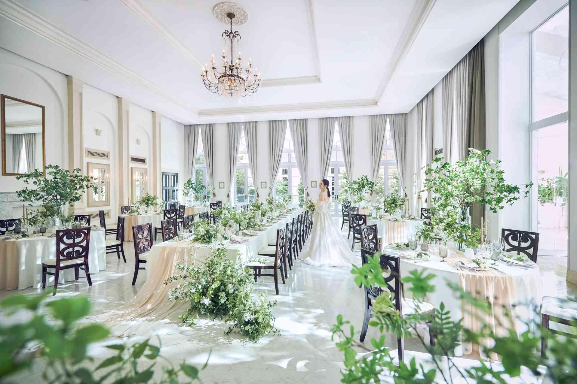 プール付ガーデンに面したバンケットは開放感溢れる明るい雰囲気、白を基調としたシンプルな会場なのでお花やドレスでおふたりらしい雰囲気にトータルコーディネートができる。(最大122名着席)
