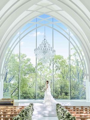 大きなガラス窓の奥に広がる木々の緑とシャンデリアの輝き。そして窓から差し込む陽光が自然のライトとなってチャペルをキラキラと輝かせ、祭壇を照らします。