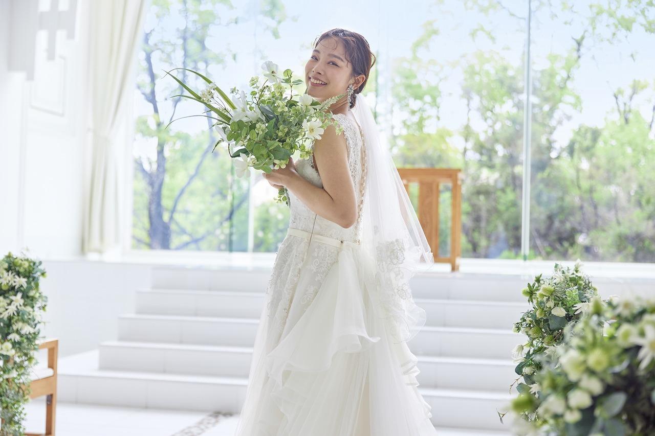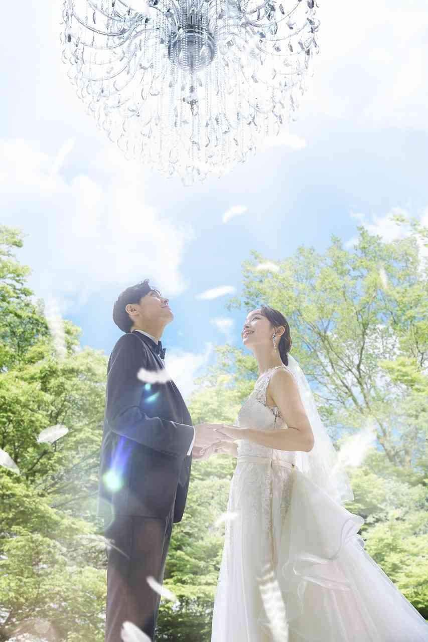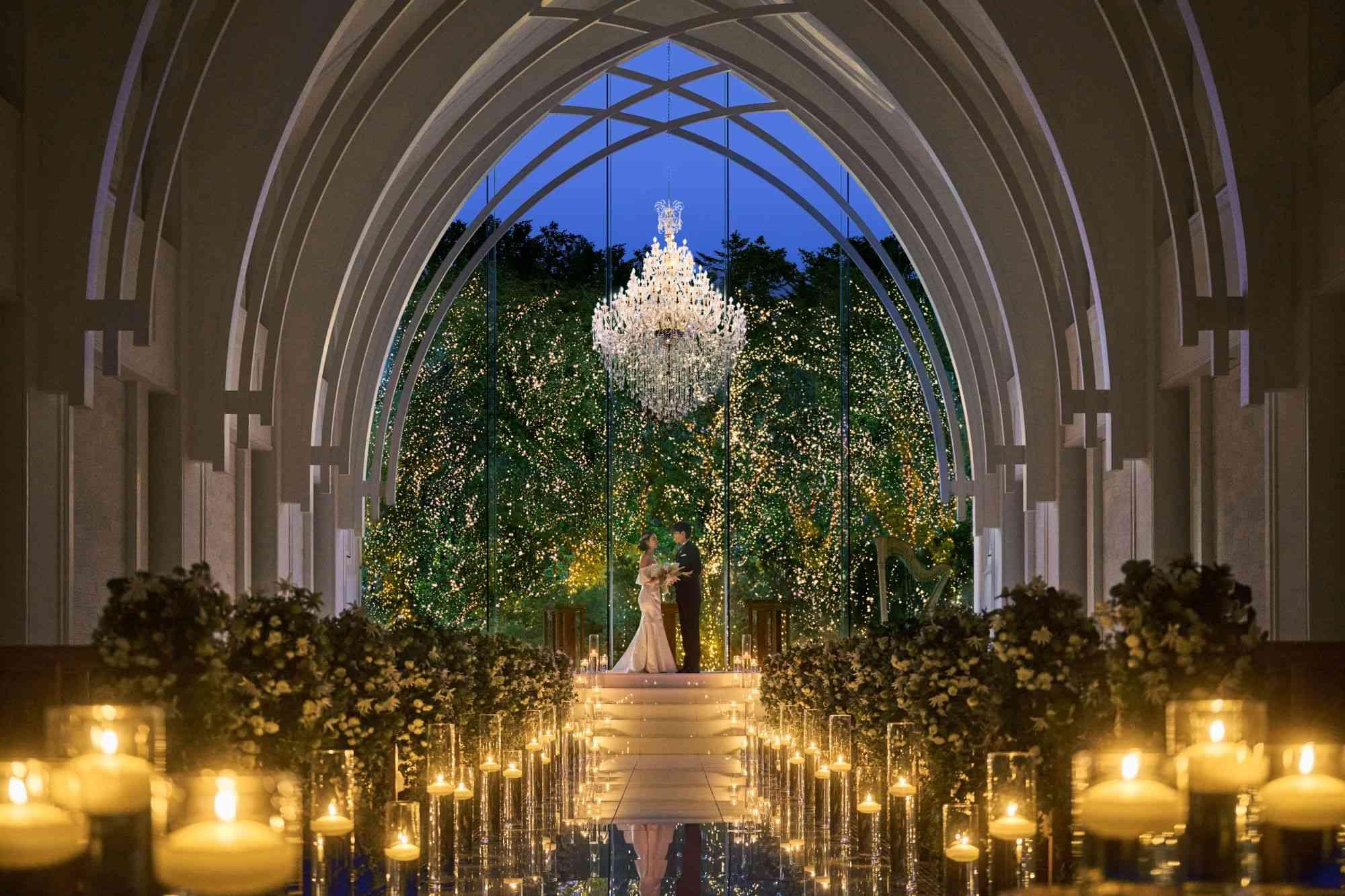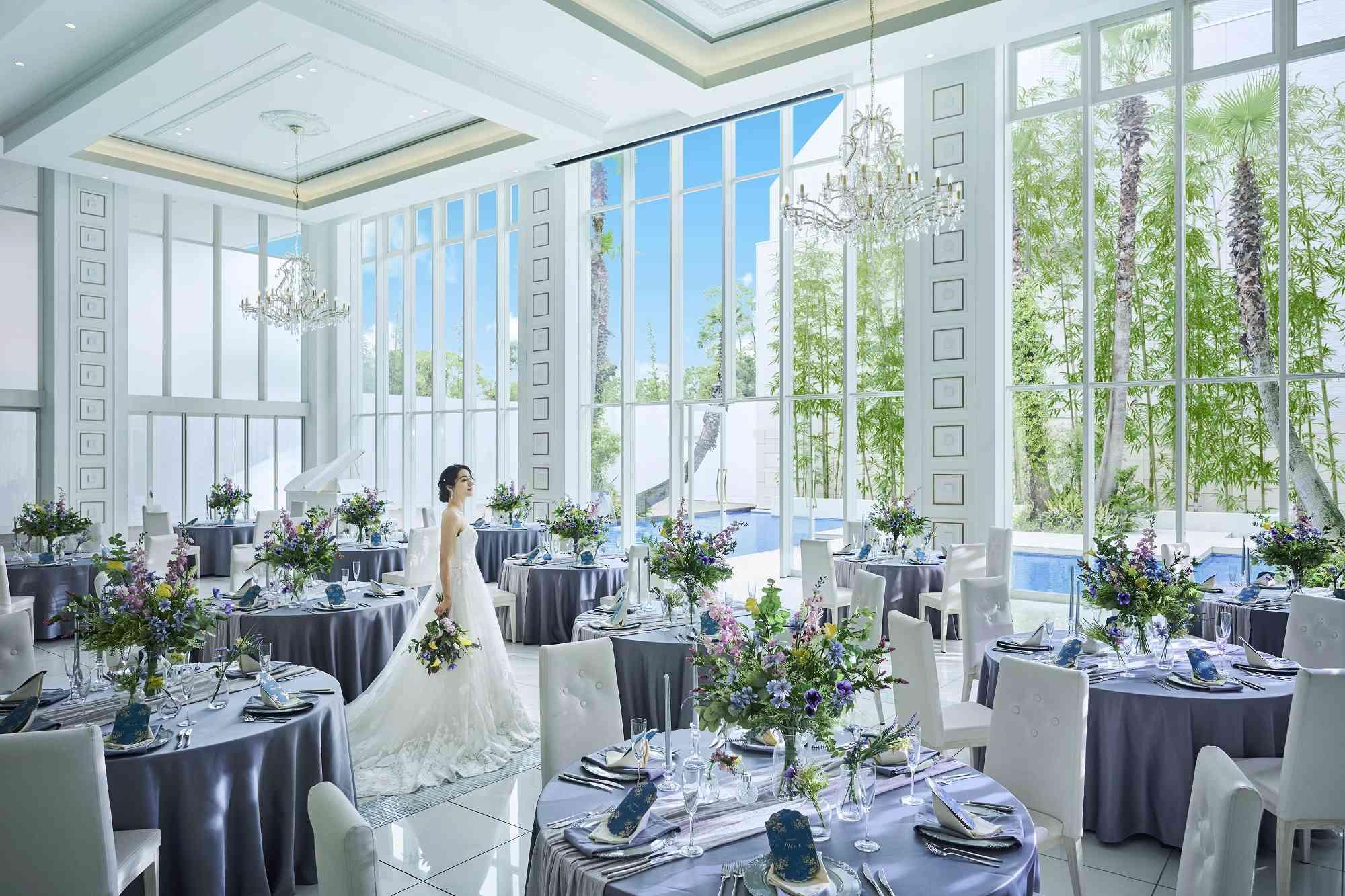 水辺に浮かぶ白基調の会場。天井高は6メートル。150名まで着席可能。披露宴会場内にはオープンキッチンが併設されており、出来立ての料理を提供。またガーデンもあるのでデザートビュッフェなどの演出もできる。