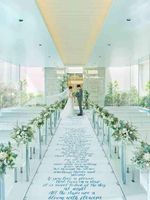 貸切のアクアチャペルだからこそ、お二人らしいコーディネートも可能。オリジナルのメッセージ&花びらを合わせたバージンロードはイチオシの演出!!水上に浮かぶアクアチャペルを彩るオリジナルバージンロードは、一生に一度の結婚式だからこそ、花嫁にとって忘れられない特別な存在になること間違いなし!