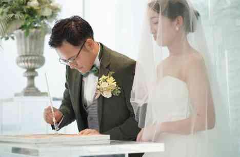 人前式を選ばれたのは、大好きなゲストに夫婦となる瞬間の証人になってほしいからでした。だからこそ、みんなで創る結婚証明書が必要でした。テーマが遊び心なので、ご来館されたゲストが自由にキャンバスを彩れるようにさせていただきました。挙式の署名の際は、おふたりのお名前を描いていただき、完成して披露までしていただきました。