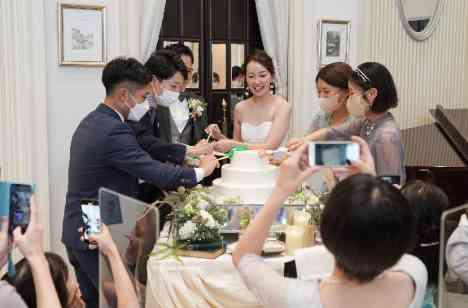 披露宴でも遊び心を忘れませんでした。フルーツも乗っていない真っ白なケーキには、選ばれし4名のゲストとおふたりでクリームをペイントしていきました。なんとゲストの皆様も遊び心満載で、完成したケーキは決して上手とは言えませんでしたが、おふたりらしいテーマが溢れるウェディングケーキが完成いたしました。そして、皆様のデザートとしてご提供いたしました。