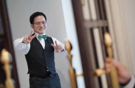 新郎さんが会場スタッフに紛れ込んでのお色直し入場でした。通常であれば一緒に入場してくるふたりですが、なんと新婦様が階段からおひとりでご入場!あたふたされる新婦さんが、どこに新郎がいるのだろうと会場を見渡すとスタッフに紛れて手拍子をしていました。ゲストの方々からも笑いが起きる、遊び心だけでなくユーモアに溢れたシーンになりました。