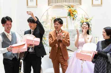 ゲストとの楽しいお時間はガーデンセレモニーや披露宴で沢山お取りいただきました。その中でも楽しみにされていたのが新郎様のゲストにご参加いただいた「ゴムパッチン」。ご指名いただいたゲストはもちろん、周りの方たちも笑顔溢れる瞬間でした。また、家族とのお時間も大切にして頂ければと思い、ファーストミートを行いました。おふたりと親御様だけで過ごす特別なお時間で、いつもとは違う親御様のご様子も垣間見えました。