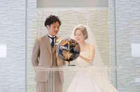 おふたりは海外旅行が大好きでしたのでお打合せで地球儀を結婚証明書にするご提案をさせていただきました。 ロビーのウェルカムスペースに地球儀証明書を置き、来館されたゲスト皆様にメッセージを集めさせていただきました。 人前式本番では、新郎ご新婦様がサインをして皆様に地球儀証明書を披露して世界に一つだけの証明書が完成しました。