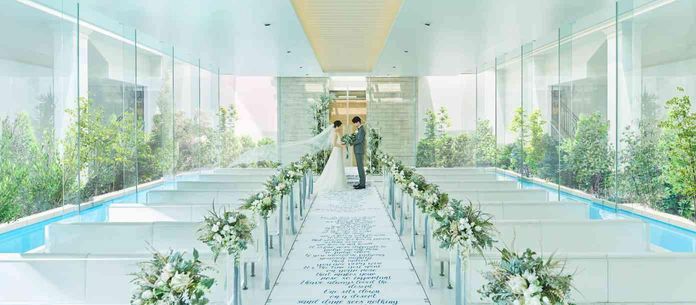 四方がガラス張りのチャペルは緑に包まれ、写真映えする挙式シーンを演出します