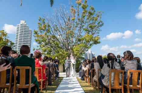 和歌山の海を一望しながら過ごせるガーデン挙式 オーシャンビューを楽しみながらいつもとは違う挙式体験が和歌山のこの会場だからできます。 開放感が最大に味わることができるガーデン挙式は和歌山でもこの会場にしかない特別感。 ゲストもよりリラックスして過ごすことができます。 人前式でオリジナルだからこそゲストも一体となって過ごすことが実現。