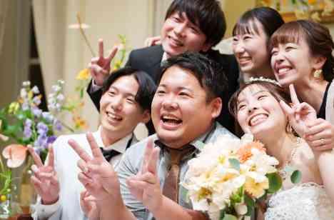 披露宴は新郎様が大尊敬する上司の方の乾杯のご発声で始まり、その後皆様が自由に動き回りグラスを合わせるにぎやかな場面が見られました。ゲストの方とのふれあいを大切にしているおふたりだったので、ご披露宴の前半も後半も歓談・フォトタイムの時間をたっぷりとりました。カラフルなお花に包まれたソファー席で、写真のようにみんなでギュッとくっつき、おそろいのポージングで撮影を楽しんでいました(⌒∇⌒)