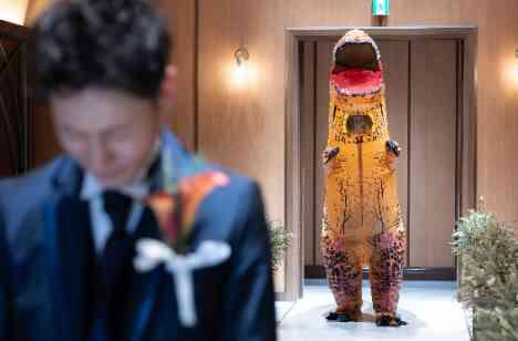 楽しませるのが大好きなお二人。ファーストミートでご新郎ご新婦様とご対面のはずでしたが、ご友人様を巻き込んだファーストミートを実施しました。ご新郎様には後ろ向きで目を閉じていただき、いざ振り返っていただくと、いるはずのご新婦様ではなく、なぜか恐竜の着ぐるみを着たご友人様、天使のかっこをしたご友人様、、、、そして3度目にようやくご新婦様とご対面することが出来ました