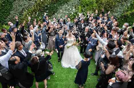 堅苦しくなく、来ていただく全員が感情を全部出して思いっきり楽しんでほしい。そんな思いから、皆様に並んでいただきながらのフラワーシャワーではなく、ガーデンにて大切な皆様に囲まれながらの一斉のフラワーシャワーをご提案させていただきました。近い距離だからこそ、ゲストの皆様の感情がより溢れ、お二人にとっても素敵なシーンとなりました。
