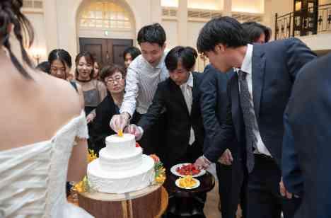 出来上がったケーキをお二人が入刀するのではなく、せっかくならお世話になった皆様にお手伝いいただき、ゲストの皆様と一緒にケーキを創り上げられました。ケーキ入刀前、あえてシンプルなケーキが登場、ゲストの皆様にフルーツを盛り付けていただきケーキを完成させるセレモニーを実施しました。ゲストの皆様にも参加していただいたセレモニーはアットホームな雰囲気に包まれました