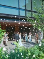 挙式の後はアフターセレモニーへ。隣接するガーデンテラスでもフラワーシャワーなどの演出が可能。自然光に包まれながら、ゲストからの祝福を受けて。