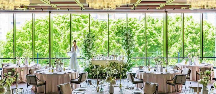 フロア貸切できるパーティ会場は全3タイプ。どこを選んでも窓一面に緑が広がり、パークフロントならではの美しい景観がゲストを迎える。皆が自然体で過ごせる開放的な空間で祝福の笑顔に包まれるパーティを。光をまとう花嫁が美しく映える特別な空間。