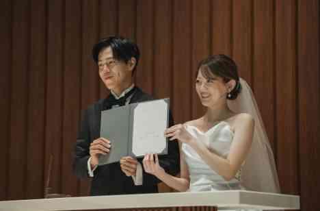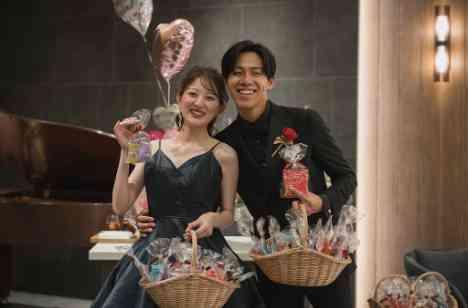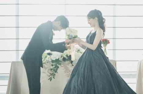 ご新郎様からご新婦様へダーズンローズのサプライズを。 1本1本意味が込められた12本の薔薇をゲストから受け取るご新郎様。 集めた薔薇はご新婦様への想いがつまった花束となりました。 高砂で待つご新婦様にメッセージとともにプレゼント。 お色直しはネイビカラーの1着。 ハリと微光沢の質感が上品で軽やかな印象のドレスです。贈られた薔薇のブーケがより美しく映えるドラマティックな装いとなりました。
